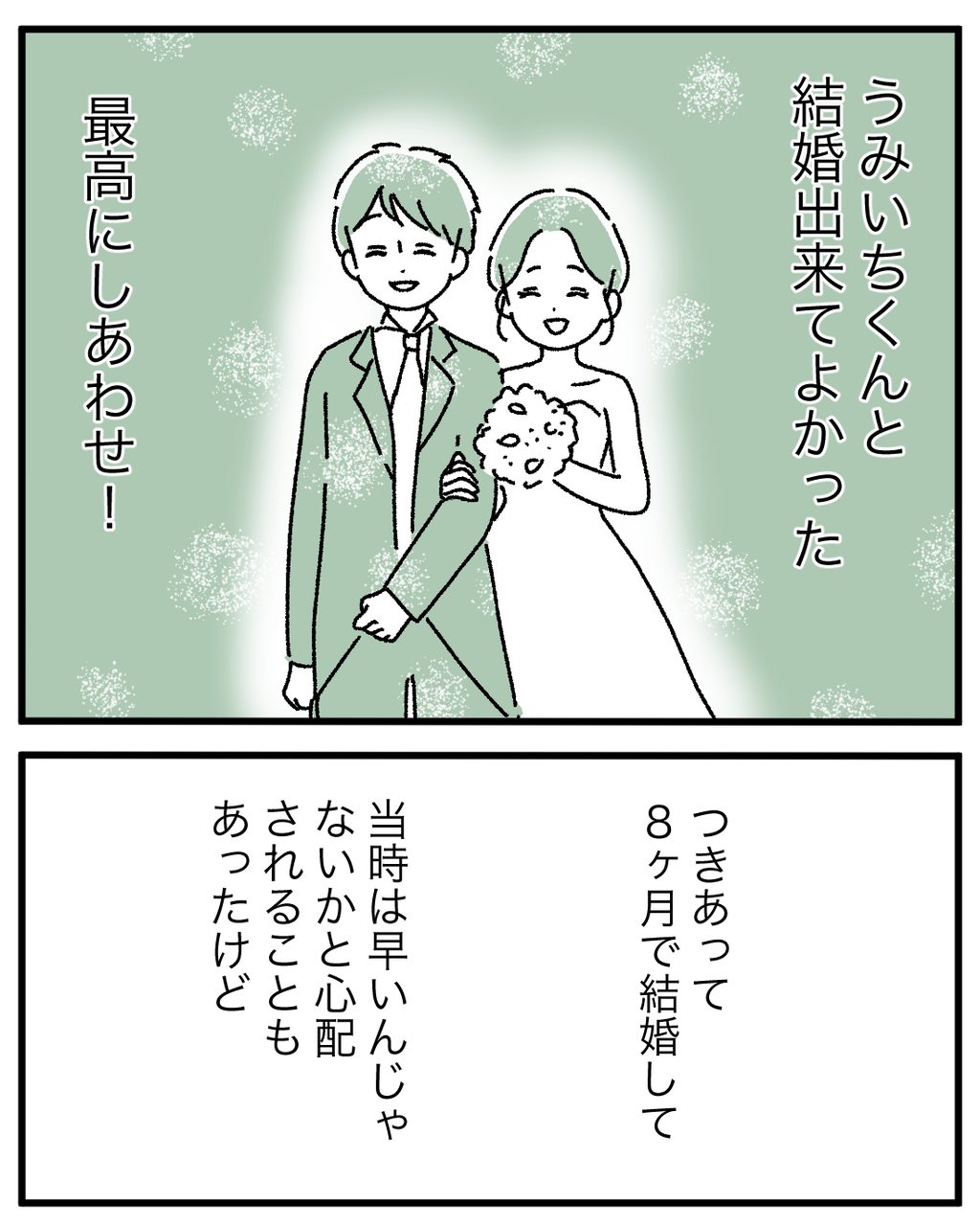 つきあって8ヶ月で結婚しました 最終回 2022年12月10日 ご愛読いただきありがとうございました! 「つきあって8ヶ月で結婚しました」カテゴリの最新記事 < 前の記事次の記事 > コメント コメント一覧 (5) 1. な 2023年08月27日 00:32 なんでうみいちは結婚を急いでいたんだろう? もっと2人で話す機会を設けて貯金をして、お互いを知って、計画的に準備するべき 0 うみこ がしました 2. み 2023年08月27日 14:56 >>1 結果、結婚10年たった現在もご家族仲良く暮らされてるのですから、それが全てではないでしょうか。 計画的に進めていても、結婚してすぐ別れるカップルも沢山いるし、交際期間が短くても運命ならうみこさん達のように上手くいくのでは? 0 うみこ がしました 3. うみこ 2023年08月27日 15:07 >>2 ありがとうございます🥲💓 0 うみこ がしました 4. ゆうた 2023年09月03日 20:20 楽しく読ませていただきました。 私もまわりが結婚が早かったため 急いで結婚しました。 今幸せです! 計画的じゃないとみんなに言われましたが、 子供も10歳になり今でも幸せです! 色々共感しました。 0 うみこ がしました 5. つらら 2023年10月03日 13:13 どんな形であれど今か充実している日々なら最高ですね😌✨ 0 うみこ がしました コメントフォーム 名前 コメント 記事の評価 リセット リセット 顔 星 情報を記憶 コメントを投稿する