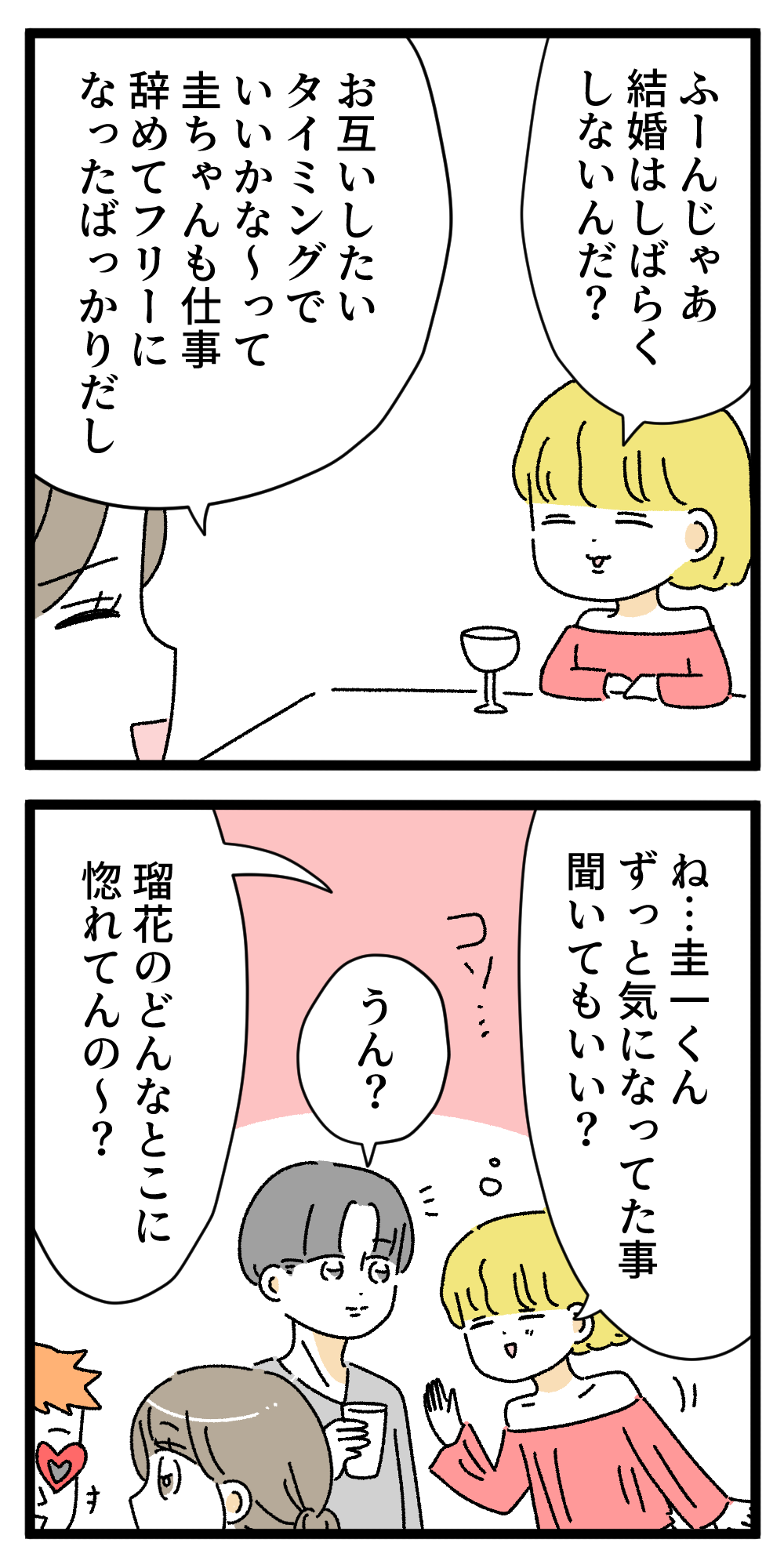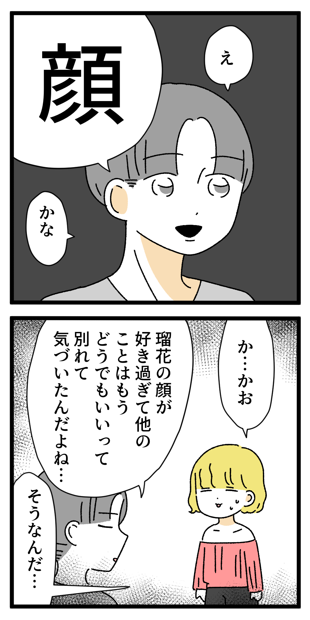 僕の彼女はインフルエンサー104【最終回】 2024年08月04日 僕の彼女はインフルエンサー最後までお読みいただきありがとうございました!!瑠花は結構嫌われてしまうかな...と思っていたのですが好きです!と言ってくださる読者の方も多くて励みになりました。Kindle限定公開で2人の後日談を掲載しているのでその後が気になる方はぜひ読んでみてください✨長いので1.2話に分けております。全話無料で読めます!僕の彼女はインフルエンサーKindle版新連載もぜひ!シングルマザーの恋のお話です。 「僕の彼女はインフルエンサー」カテゴリの最新記事 < 前の記事次の記事 > コメント コメント一覧 (45) 1. 顔… 2024年08月04日 20:30 散々コメ欄で議論されてた「ルカのどこがいいの」の答えが顔… 確かにお似合いの二人だね 圭ちゃんのキャラが初期とだいぶ変わったように感じるけど圭ちゃん視点だったからで、元々ちょっと変わったところがある人だったのかも 0 うみこ がしました 8. 圭ちゃん 2024年08月04日 21:05 >>1 確かに元々ちょっと変わったところがある人だったかも。でも彼女の好きなところが顔って言うのはごく普通の男性だった笑 0 うみこ がしました 2. 圭ちゃんの印象が最初と違う... 2024年08月04日 20:43 顔って言ったときの圭ちゃん ゾワってした。やっぱりお似合いだわ。 末長くお幸せに。 0 うみこ がしました 3. お! 2024年08月04日 20:46 なかなか圭ちゃんが最後に毒っぽいことを言ってくれて嬉しかった笑 ルカには完全無欠な男はもったいないからなー 0 うみこ がしました 4. ニキちゃん 2024年08月04日 20:47 連載お疲れ様でした。 やっぱり圭ちゃんも変わってる人だな〜😂ルカ可愛いもんね♡ ニキちゃんが良い子すぎて好きです!素敵な彼氏ができて良かった! みんなお幸せに! 0 うみこ がしました 5. 顔が好き! 2024年08月04日 20:57 男性が女性の顔にベタ惚れって正直あるあるだよね笑 気難しいタイプよりそれくらい単純な男の方が幸せな気がする。 加齢で劣化したとしても意外に魔法は解けない笑 0 うみこ がしました 33. あ 2024年08月06日 02:45 >>5 めっちゃわかります。 そこまで嫌悪することかなって思いました。 0 うみこ がしました 6. 顔 2024年08月04日 21:02 私の夫も私のどこが好きか聞いたら顔って言ってる。 顔がタイプだから手離したくないらしい笑 逆にどんなに性格良くても顔が好きじゃないと絶対無理みたい。 0 うみこ がしました 46. 名無し 2025年01月13日 21:43 >>6 仕事できなそうな人だね 0 うみこ がしました 7. わぁ😢そういうタイプか😅なんかガッカリ 2024年08月04日 21:03 私は子持ちの既婚者です。結婚10年目。 顔が好きでお付き合いや結婚した方に聞きたい!! もしその大好きな顔が崩れてきたらどうしますか??シワやシミも愛せますか?? 性格が悪すぎても顔が良ければ許せますか? 昔付きあった3つ年上の方で カッコ良いのに気さくで優しくて大人なところが好きだったのに、付きあったら 自分が優しくされたいからってする表面だけの見せかけの優しさだったり、全然子供な考えや行動をする幼稚な彼にガッカリ…好きなところが顔がカッコいいしか残らなかったらなんの愛情もわかず3ヶ月で別れたことがあります。 本当に顔だけがタイプでずーっと愛せるものなのか疑問…。 0 うみこ がしました 10. 程度問題 2024年08月04日 21:13 >>7 たぶん程度問題だと思います! いくら顔が好きでも性格悪すぎる相手なら冷めると思う。少し嫌なところあるけど顔が好きだからまぁいっか〜って思える相手ならそれ程問題じゃないのかも。 あと女性より男性の方が見た目への重視度が大きいと思う。 0 うみこ がしました 13. ななし 2024年08月04日 21:24 >>7 顔が好きってイケメンとか美人とかじゃなくて、自分の好みかどうかじゃないかな 個人的なことだけど、私の好みの顔の人は私の顔を好みと言ってくれることが多いです 私は丸顔で目がクリクリですが、好きな顔は一重の面長で自分とは逆の顔 多分、本能的に選んでるんですよ 骨格から好きな顔は多少太ったり年老いても変わらないです 夫は多少髪も明日かなり顔も弛んできたけど、やっぱり好きな顔だなと思うので 0 うみこ がしました 15. 同意 2024年08月04日 23:02 >>13 好きな顔って普遍的というか、多少変わっても嫌いな顔になることはないですもんね 少しでも変わって嫌いになるならそれは若くて綺麗な顔が好きなだけで、その人の顔が本当に好きだったというわけではない気がします 0 うみこ がしました 19. 好きな顔が歳取るだけ 2024年08月05日 01:59 >>7 顔だけが好きなわけでもないけど、 顔が好きじゃなかったら許せないこと多々ありますよ。笑 0 うみこ がしました 30. ねこずき 2024年08月05日 20:25 >>7 ルックスから入って結婚20年。 いまだにスタイルも良くカッコイイ夫です。 でも中身が空っぽだとダメですね。 顔が良い分、なおのことアホなのは許せん。 20年たって思うのは、やはり中身が大事です。 0 うみこ がしました 9. 幸せになってよかった! 2024年08月04日 21:09 カブチュウさんが詐