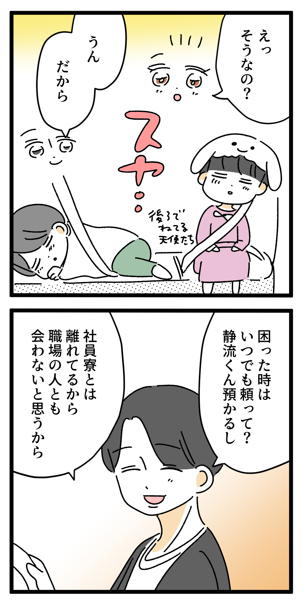 男女の同期がいい感じだったので、前の席に座らせて、私と友人は空気を読んで後ろの席で静流くん達みたいに「天使の寝顔」してました。