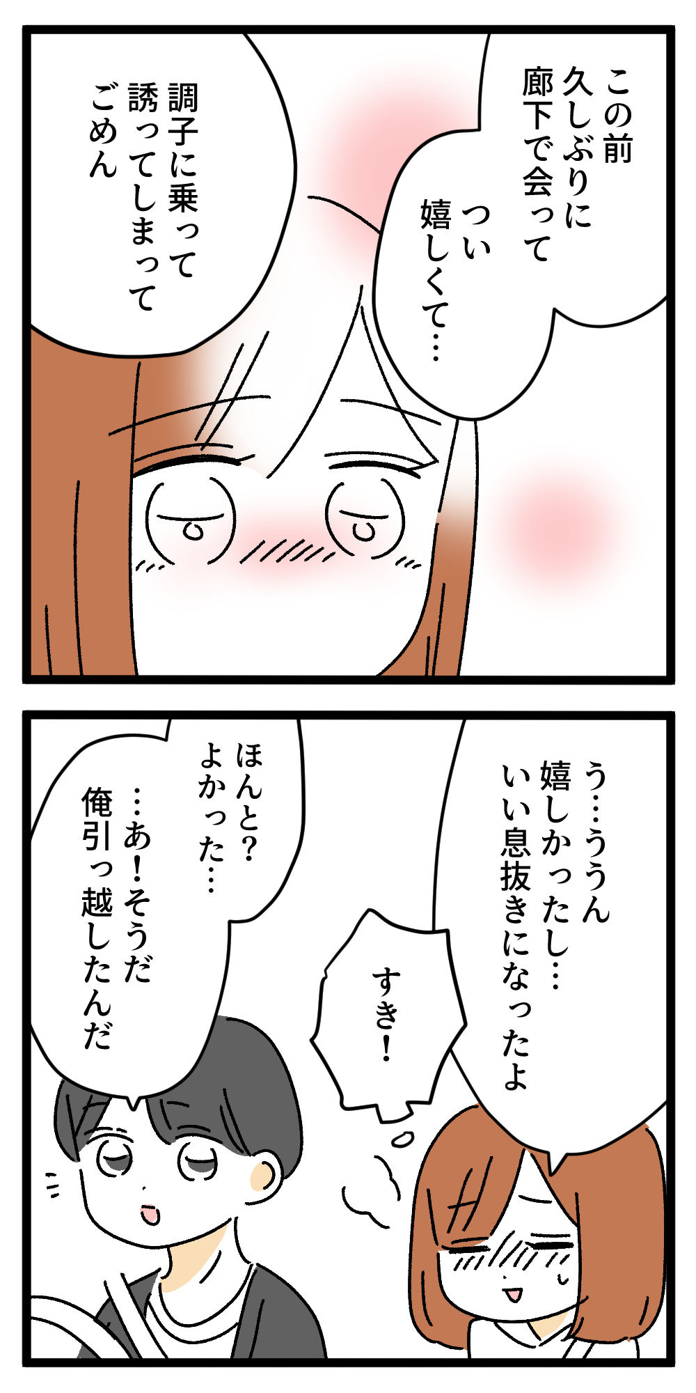 子持ちが恋しちゃダメですか?66 2024年12月14日 温泉の話を描いてたら温泉に行きたくなり今行ってきました🚗³₃露天風呂から見る月がとても綺麗でした🌙寒い中のサウナは最高だなあ🕺つづき 「子持ちが恋しちゃダメですか?」カテゴリの最新記事 < 前の記事次の記事 > コメント コメント一覧 (8) 1. ほんわかしました 2024年12月14日 21:57 私も温泉行きたくなってきました!笑 るい君が良い人でよかったよ。 再婚は慌ててすることではないけど、 タイミングもあるから勢いも大事だと思う。 幸せになって欲しいなあ。 0 うみこ がしました 2. 🤭 2024年12月14日 22:53 今日会社の独身グループで遊びに行ったんだけど、車中での会話にそっくり!! 男女の同期がいい感じだったので、前の席に座らせて、私と友人は空気を読んで後ろの席で静流くん達みたいに「天使の寝顔」してました。 0 うみこ がしました 3. うみこ 2024年12月15日 06:37 >>2 それは天使すぎる👼🤍 0 うみこ がしました 8. 名無しの権兵衛 2024年12月16日 10:37 >>2 素敵なお話すぎてほっこりしました🥰 0 うみこ がしました 4. 名無し 2024年12月15日 12:18 るい君、優しいね。 引っ越しまでする気づかい! 0 うみこ がしました 5. ほこほこしながら 2024年12月15日 12:32 読んでたら、「温泉今行ってきた」とあり、 すげぇ!ってなりました。 0 うみこ がしました 6. うみこ 2024年12月15日 13:09 >>5 サウナで整ってきました🧖♀️ 0 うみこ がしました 7. もう! 2024年12月15日 15:12 早くくっついちゃえよ! 0 うみこ がしました コメントフォーム 名前 コメント 記事の評価 リセット リセット 顔 星 情報を記憶 コメントを投稿する