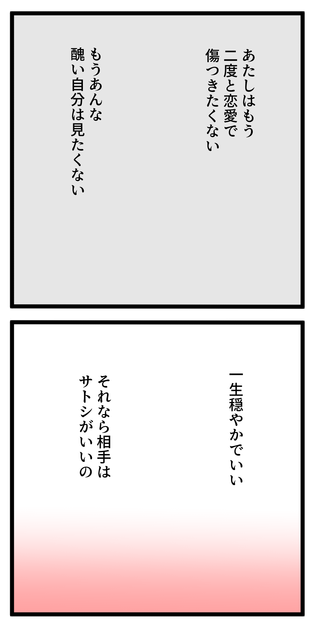 でも結局また振られてその頃サトシは大出世して結婚して幸せになってる。タイトルの通りに自分が一番可愛いから他人を傷つけて最終的に本当の幸せは得られないって終わり方を予測