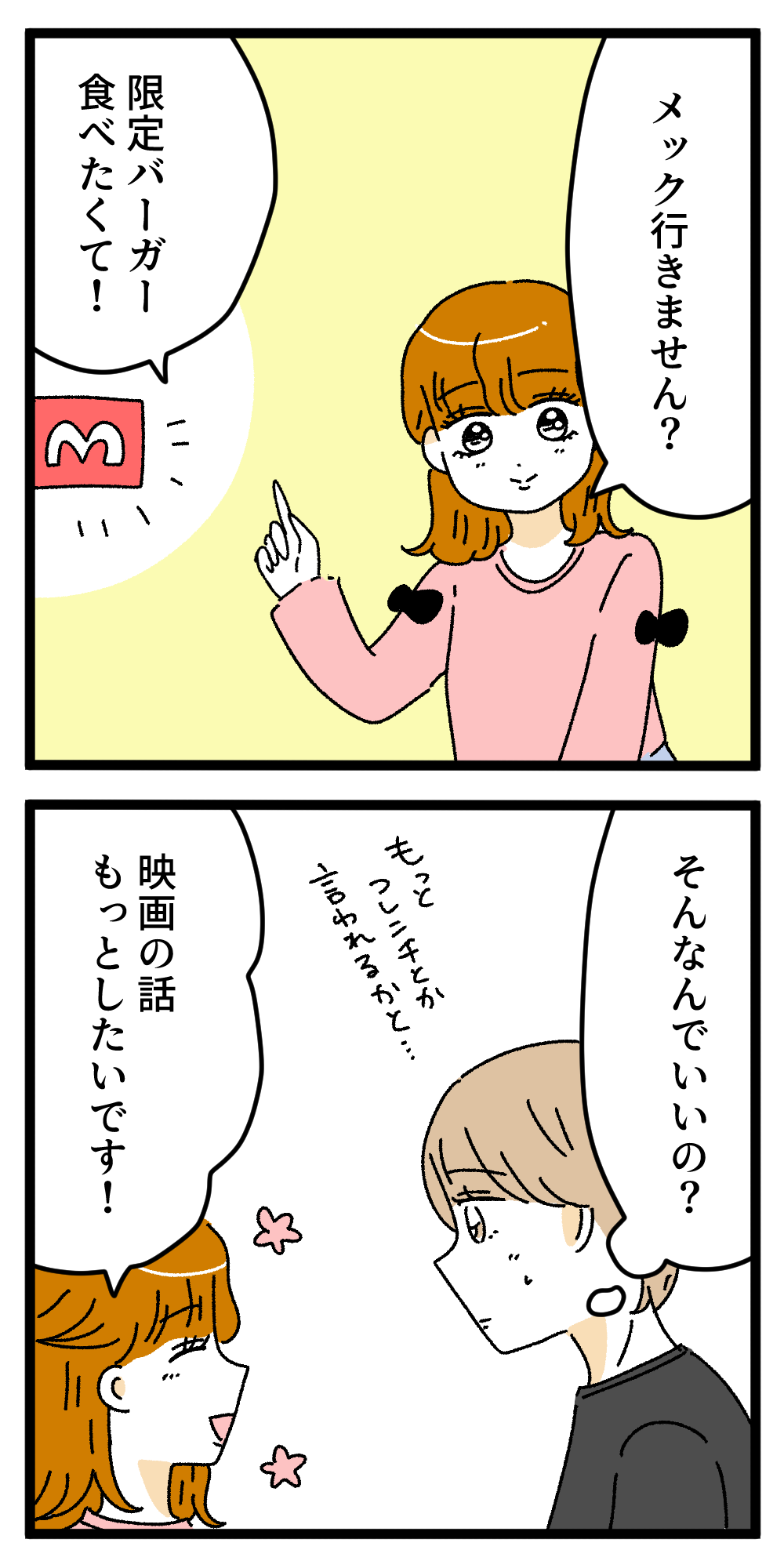 会った瞬間映画始まっちゃう急がなきゃ〜!(チケット購入済みで断れないようにしてる)チケット代いいのでご飯奢ってください(一緒にいる時間伸ばしたい)リーズナブルなハンバーガー選ぶ(奢りだからって良い所選ばないいい子ちゃん)私も好きです〜!(知らなくてもとりあえず共感して後からでも調べられる)